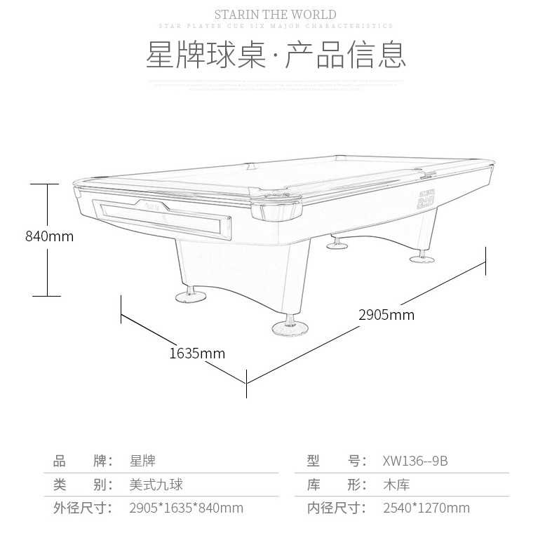 - 星牌 XW117-9A 美式臺球桌
